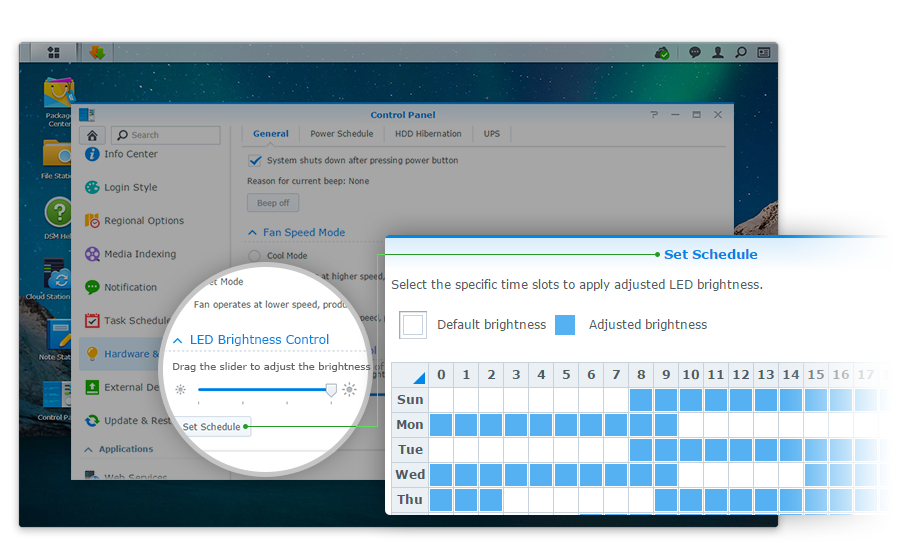DS216j 配備可調整亮度的 LED 指示燈,讓你可以針對前方面板的 LED 燈進行四種明暗度及排程設定,根據所處環(huán)境決定舒適的亮度。