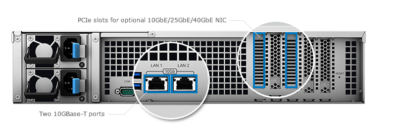 FS3017 內(nèi)建雙 10GBase-T 網(wǎng)絡(luò)端口。當你需要更多的帶寬時,可透過兩個 PCIe 插槽新增額外的網(wǎng)絡(luò)控制器,也可選擇 10GbE、25GbE 與 40GbE 網(wǎng)絡(luò)適配器以發(fā)揮 FS3017 的效能。此外,通過額外購買 FS3017 支持的網(wǎng)絡(luò)適配器,iSCSI over RDMA 技術(shù)更可進一步強化約 80% 的 iSCSI 效能。