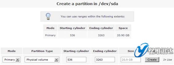 在這里,我們要創(chuàng)建一個新的分區(qū)。首先在“Create a partition in /dev/sda”處設(shè)置“Partition Type”屬性的值為“Physical volume”,在“Ending cylinder”屬性處選擇默認(rèn)值,從而設(shè)置當(dāng)前所有的剩余空間劃為一個分區(qū),最后點擊“Create”選項。如圖