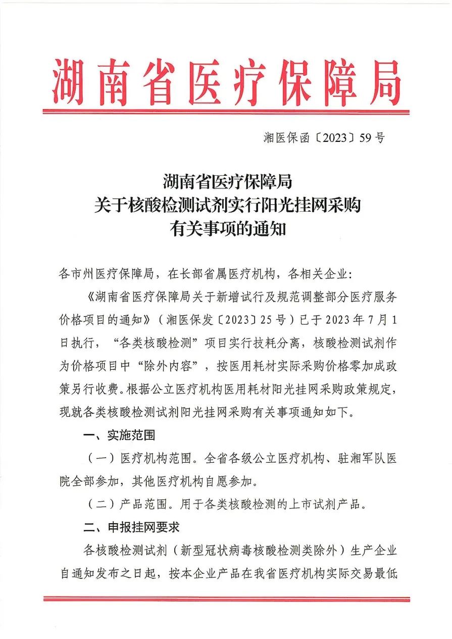 2023年8月16日,湖南省醫(yī)保局發(fā)布《關(guān)于核酸檢測試劑實(shí)行陽光掛網(wǎng)采購有關(guān)事項(xiàng)的通知》,要求相關(guān)生產(chǎn)企業(yè)將用于各類核酸檢測的上市試劑產(chǎn)品(新型冠狀病毒核酸檢測類除外)于2023年9月10日前,以湖南省醫(yī)療機(jī)構(gòu)實(shí)際交易最低價在湖南醫(yī)保招采管理系統(tǒng)申報掛網(wǎng)。