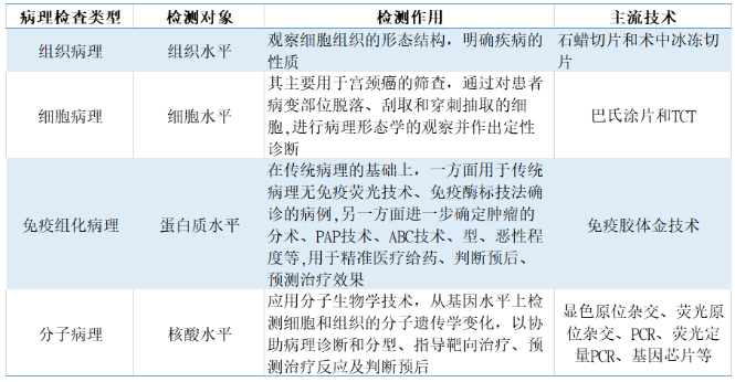 病理學(xué)根據(jù)發(fā)展階段的不同主要分為傳統(tǒng)病理技術(shù)(組織病理、細(xì)胞病理)、免疫組化病理和分子病理。傳統(tǒng)的組織病理建立在組織、細(xì)胞的水平上,可以通過(guò)病理醫(yī)師的顯微鏡診斷來(lái)判斷疾病的性質(zhì)(炎癥性病變還是腫瘤型病變、良性腫瘤還是惡性腫瘤等);免疫組化病理建立在蛋白質(zhì)水平上,可以進(jìn)一步判斷腫瘤的組織來(lái)源、原發(fā)部位、病理分型、殘留邊緣癌細(xì)胞等,除了診斷作用以外還具有指導(dǎo)預(yù)后的作用;分子病理建立在核酸分子水平上,可以確定腫瘤的基因突變類(lèi)型,用于后續(xù)靶向藥物的指導(dǎo)以實(shí)現(xiàn)精準(zhǔn)醫(yī)療。