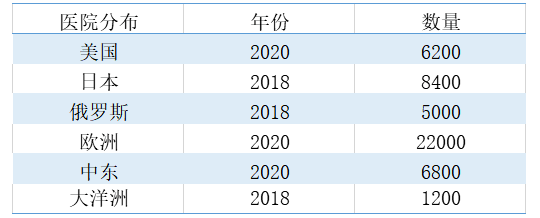 根據(jù)上圖所示,不完全統(tǒng)計(jì)表明2020年美國(guó)約有6200家醫(yī)院,歐洲約有22000家,中東約有6800家醫(yī)院,2018年日本有8400家醫(yī)院,大洋洲有1200家醫(yī)院,俄羅斯有5000家醫(yī)院。