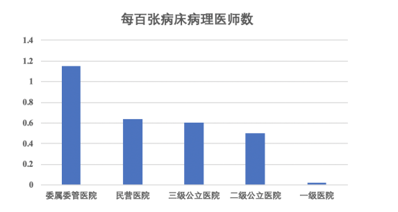 如上圖所示,其中委屬委管醫(yī)院每百?gòu)埐〈膊±磲t(yī)師數(shù)僅為1.15,三級(jí)公立醫(yī)院、二級(jí)公立醫(yī)院和民營(yíng)醫(yī)院分別為0.60、0.50及0.64。根據(jù)最新發(fā)布的《2019年全國(guó)病理質(zhì)量報(bào)告》顯示,在不同級(jí)別的醫(yī)院中,全國(guó)平均每百?gòu)埐〈膊±磲t(yī)師數(shù)量為0.55,病理醫(yī)師數(shù)量奇缺的狀況沒(méi)有改善,各省、自治區(qū)、直轄市均未達(dá)到2009年《病理科建設(shè)與管理指南(試行)》(以下簡(jiǎn)稱(chēng)《指南》)的最低要求(每百?gòu)埓?-2名病理醫(yī)師)。
