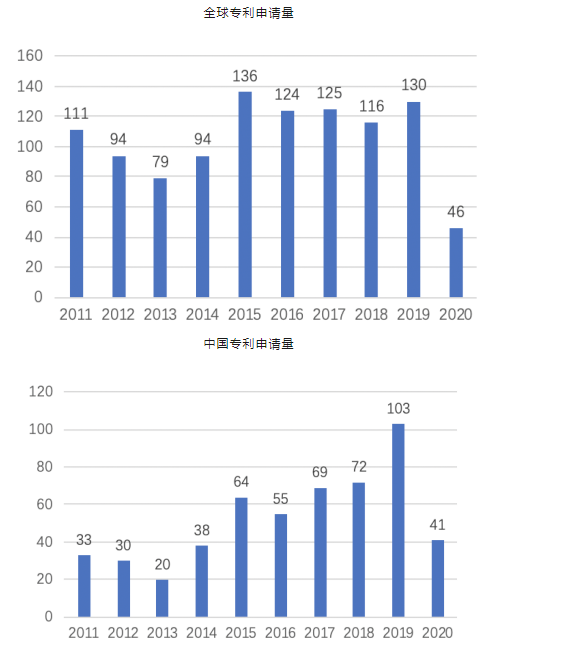 上圖所示為以“病理診斷”和“細(xì)胞病理”進(jìn)行全球檢索得到的近10年的專(zhuān)利申請(qǐng)情況。從圖中可以看出,病理診斷領(lǐng)域近10年約有1055件專(zhuān)利申請(qǐng)(由于發(fā)明專(zhuān)利有18個(gè)月公開(kāi)的滯后期,實(shí)用新型從申請(qǐng)到公開(kāi)也需一段時(shí)間,因此2019年和2020年數(shù)據(jù)有所偏差),其中發(fā)明專(zhuān)利604件、實(shí)用新型專(zhuān)利179件。從圖2中可以看出,全中國(guó)病理診斷領(lǐng)域近10年約有525件專(zhuān)利申請(qǐng)(由于發(fā)明專(zhuān)利有18個(gè)月公開(kāi)的滯后期,實(shí)用新型從申請(qǐng)到公開(kāi)也需一段時(shí)間,因此2019年和2020年數(shù)據(jù)有所偏差)。